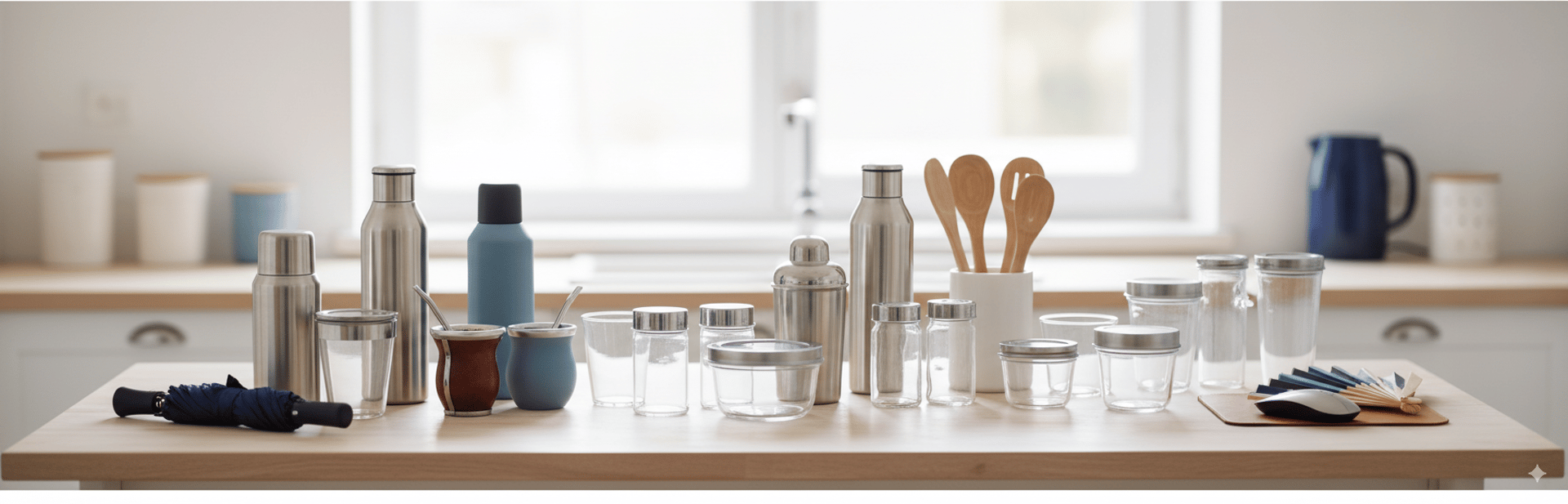 Insumos básicos para el hogar y la cocina: vasos térmicos, termos, mates, vasos de café, shakers, utensilios y todo tipo de envases. Adicionalmente paraguas, abanicos, mouse pads, entre otros.